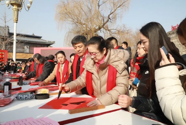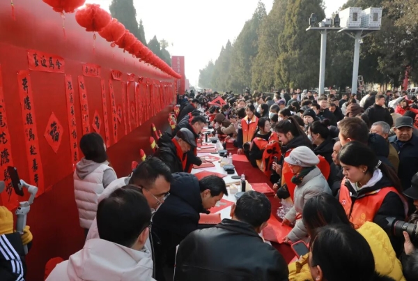 在曲阜萬仞宮墻前廣場,書法家與優(yōu)秀青少年書法作者共同揮毫潑墨,為群眾書寫春聯(lián)和“福”字。紅紙墨香間,書家們以筆墨傳遞祝福,群眾熱情參與、有序領取,場面喜慶熱烈。