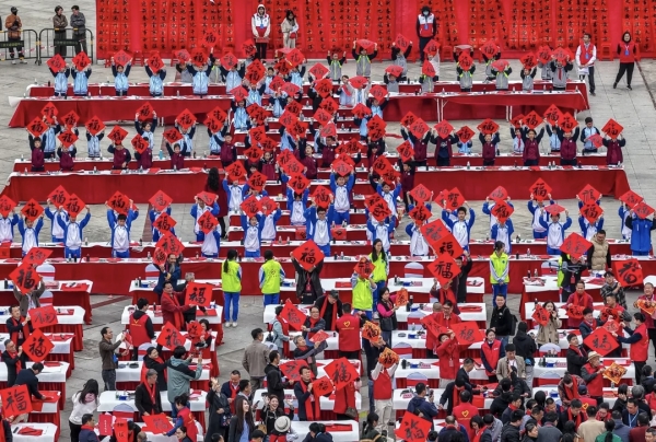 在“萬福同書”環(huán)節(jié),孫曉云、馬勇明、張桂光、鄢福初、顏奕端、葉炯光、何斌、李國(guó)芬、徐和真、黃瑞慶、Daniel Newham(大牛)、陳扶軍、孟慶星、李遠(yuǎn)東、方放、錢玉清、殷昌軍、宇文家林、陳偉、王忠勇、丘仕坤、陳志平、姜在忠、劉洪鎮(zhèn)、梁炳倫、李菲鴻、朱起明、劉劍波、李吾銘、楊忠亞、吳柱擎、陳景鋒等海內(nèi)外書法家,向來自科技、教育、公安、環(huán)衛(wèi)等行業(yè)的先進(jìn)模范和工作者代表和肇慶市民群眾,贈(zèng)送手書春聯(lián)與“?!弊?,寓意“萬福齊揚(yáng)”,讓新春的祝福隨翰墨馨香飄進(jìn)千家萬戶、傳向五洲四海。
